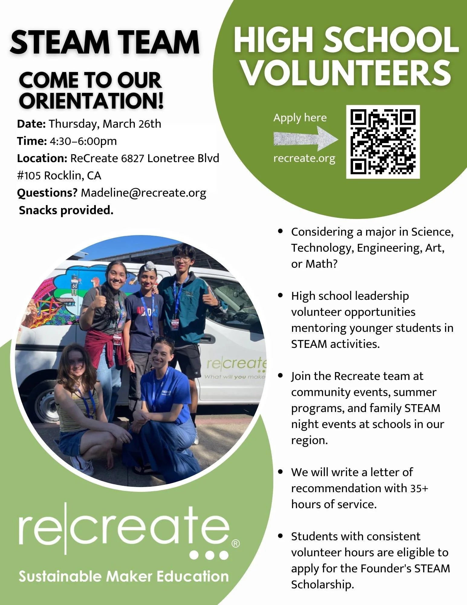 ReCreate is home to the GeniusMobile.  It is a STEAM maker education program on wheels bringing hands-on project-based learning to schools in our region.  We also host Family STEAM Nights!
