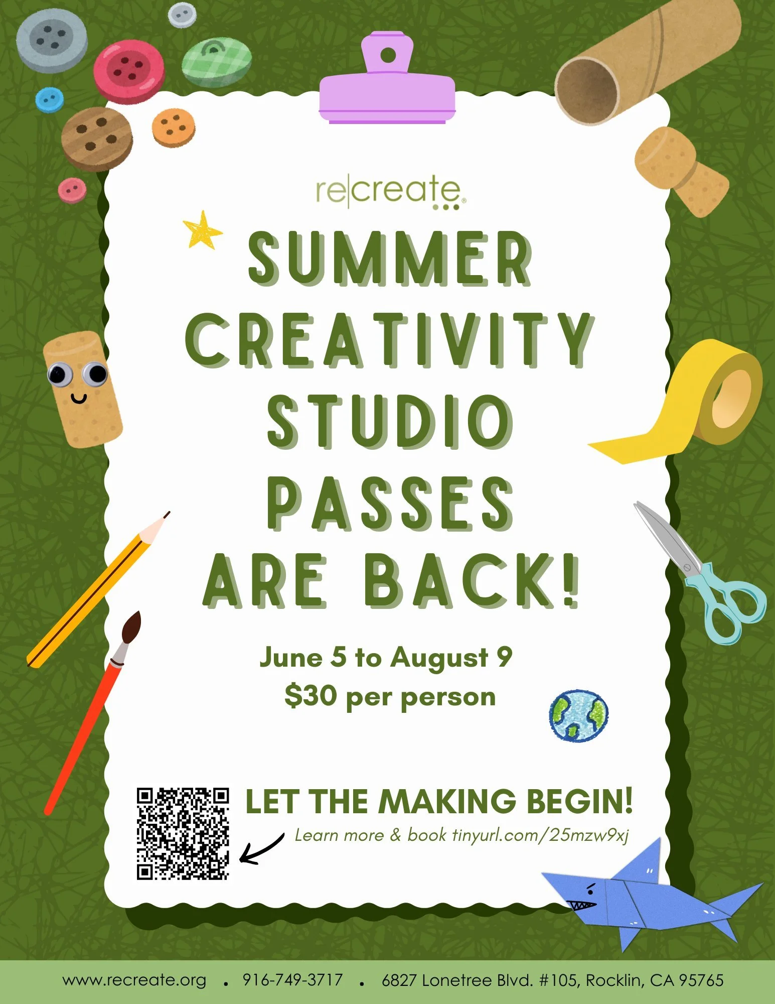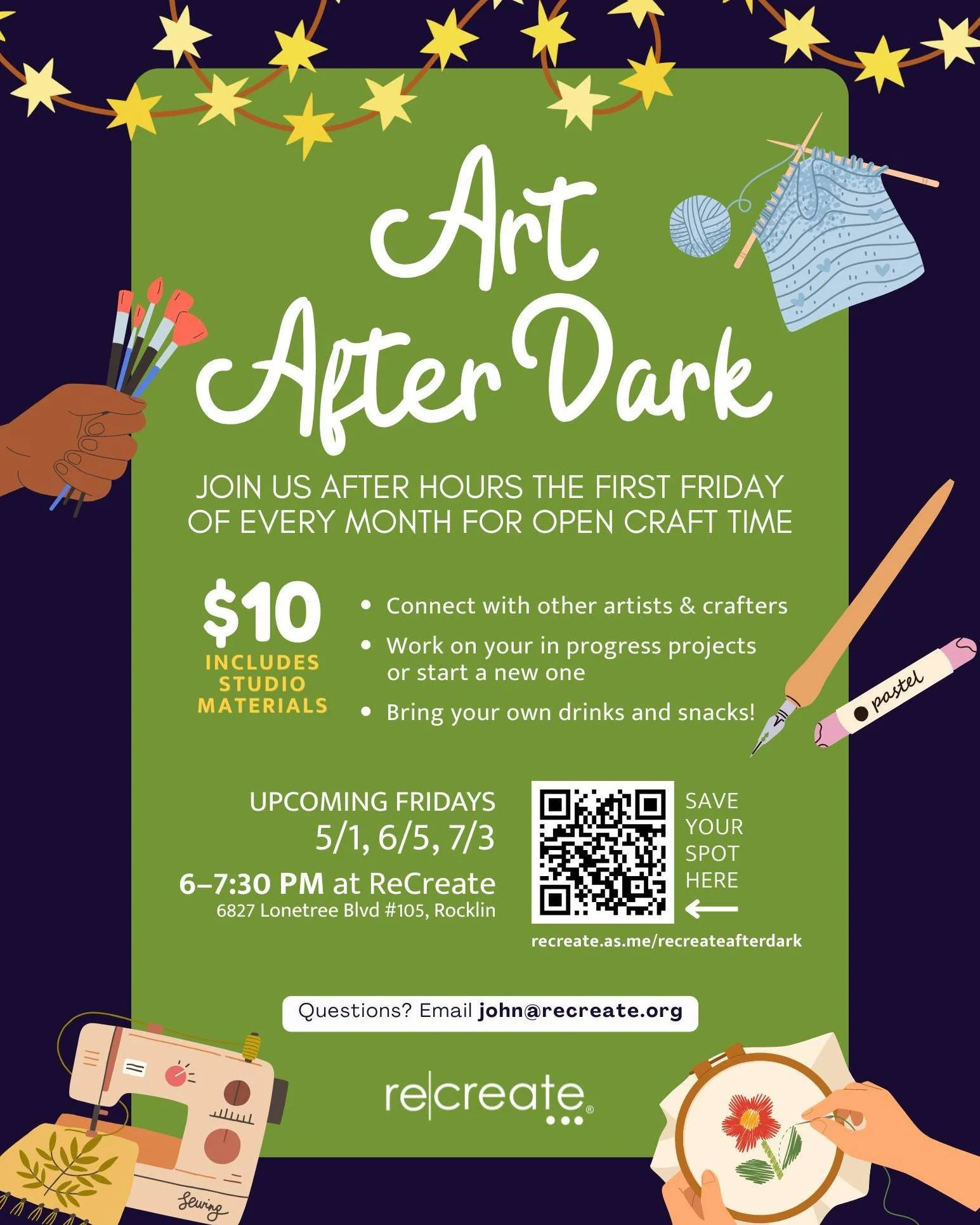 The Art and Maker Studio is ReCreate’s airy, spacious home base. We host birthday parties, field trips, kids’ workshops, as well as classes for adults. We also offer studio time by reservation or drop-in for artists and crafters of all ages. We supply the super cool diverted materials, you supply the creativity!