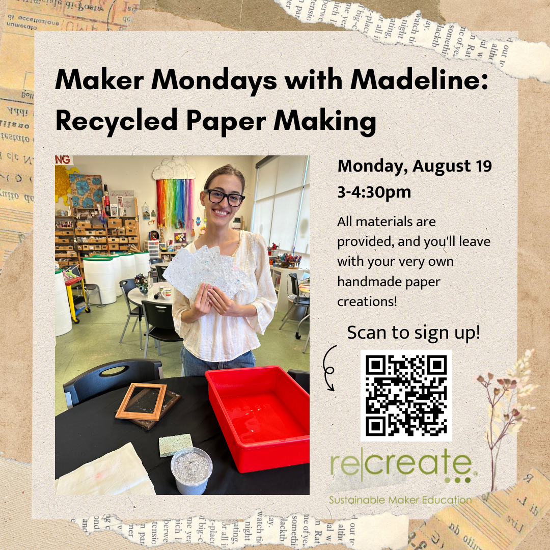 Join us for a hands-on workshop where you'll learn the art of recycled paper-making! Using everyday materials like scrap paper, blenders, and molds crafted from upcycled picture frames, you'll create your own unique sheets of paper. Add your personal touch with optional decorations like flower petals or glitter, and explore the eco-friendly process from start to finish. Whether you're a seasoned crafter or new to paper-making, this class offers a fun and creative way to upcycle and make something beautiful. All materials are provided, and you'll leave with your very own handmade paper creations!