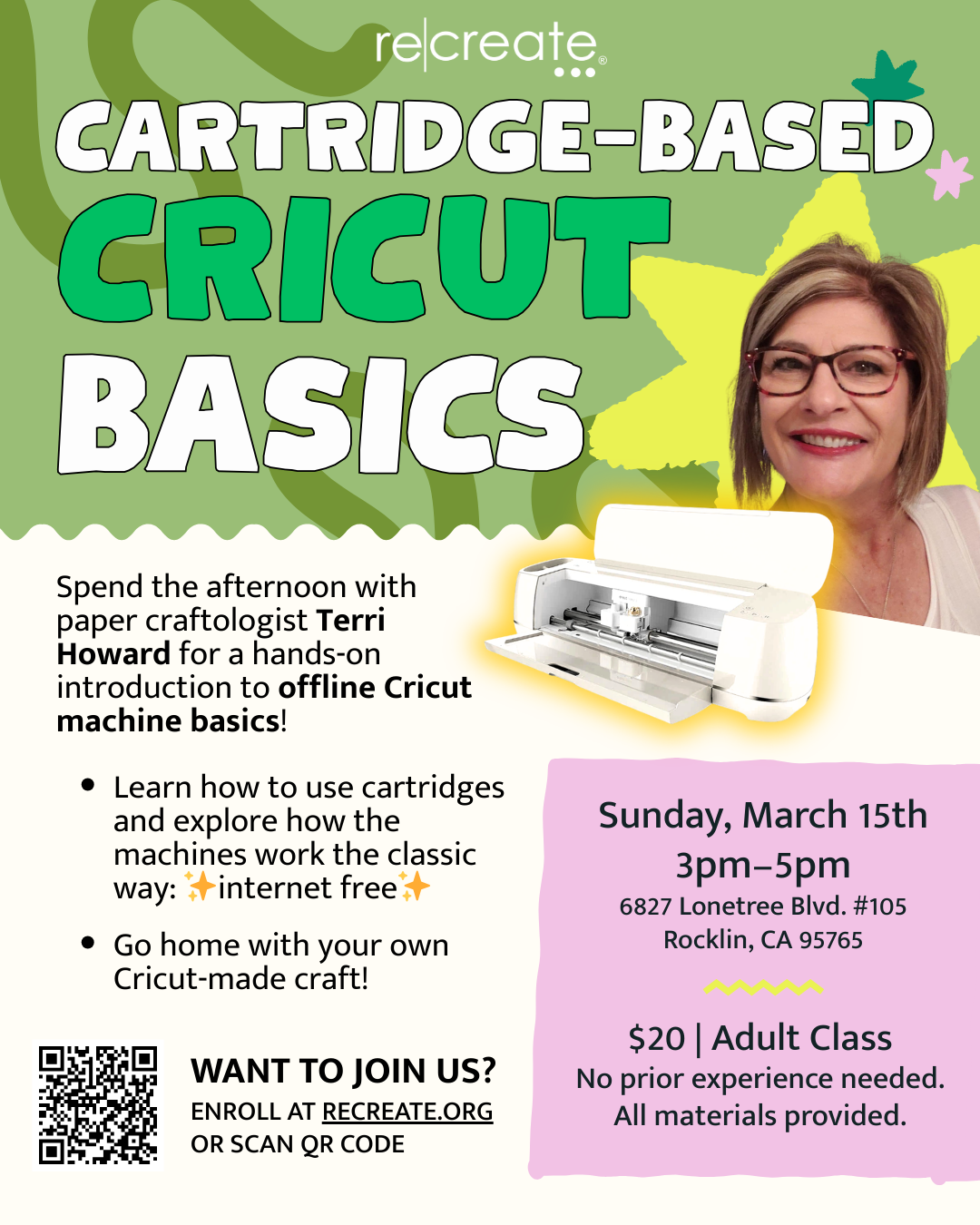 Join paper craftologist Terri Howard for a hands on afternoon exploring cartridges, creating designs, and making your own take home project. Whether you have an older Cricut at home or are simply curious, this class is a welcoming way to build skills and spark creativity.